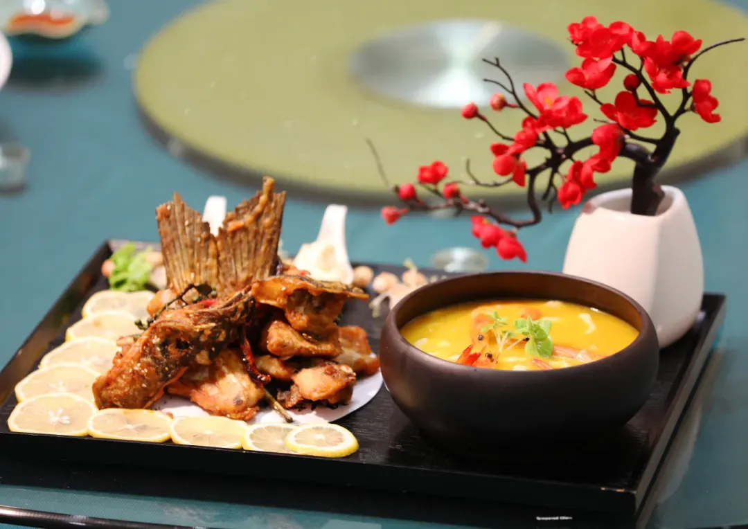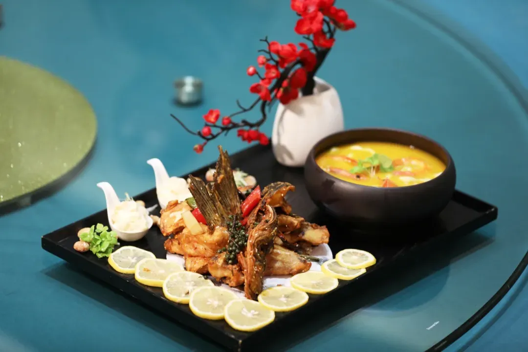 鱼头鱼尾裹薄浆炸至金黄竖立,像扬起的风帆,用藤椒和秘制香料焗炒,咸香中带着轻麻;鱼肉刮蓉制成鱼面,浸入南瓜鸡汤熬的金汤,柔滑鲜润。原木长盘作“舟”,夏威夷果为“卵石”,水果沙拉当“船桨”,摆盘如一幅湖光图。
