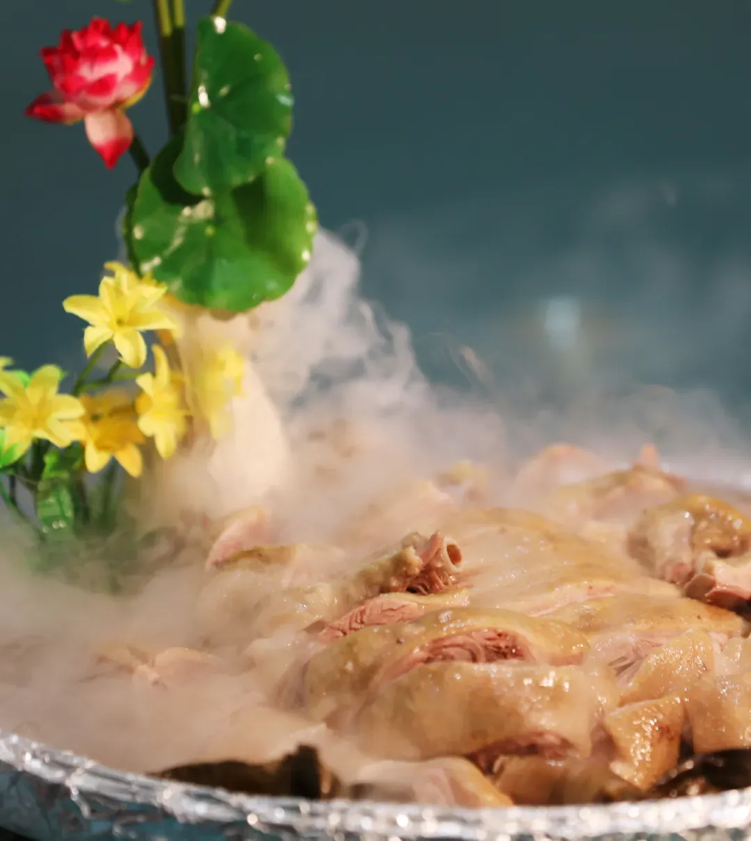 精选6-7斤的本地土鹅,用盐焗粉、姜片仔细涂抹腌制40分钟,让咸香深入肌理。最关键的是工艺升级:粗海盐炒至80℃精准控温,再用泡软的荷叶包裹鹅身埋入盐中焗制,45分钟后关火焖10分钟,荷叶清香与鹅肉油脂完美交融。