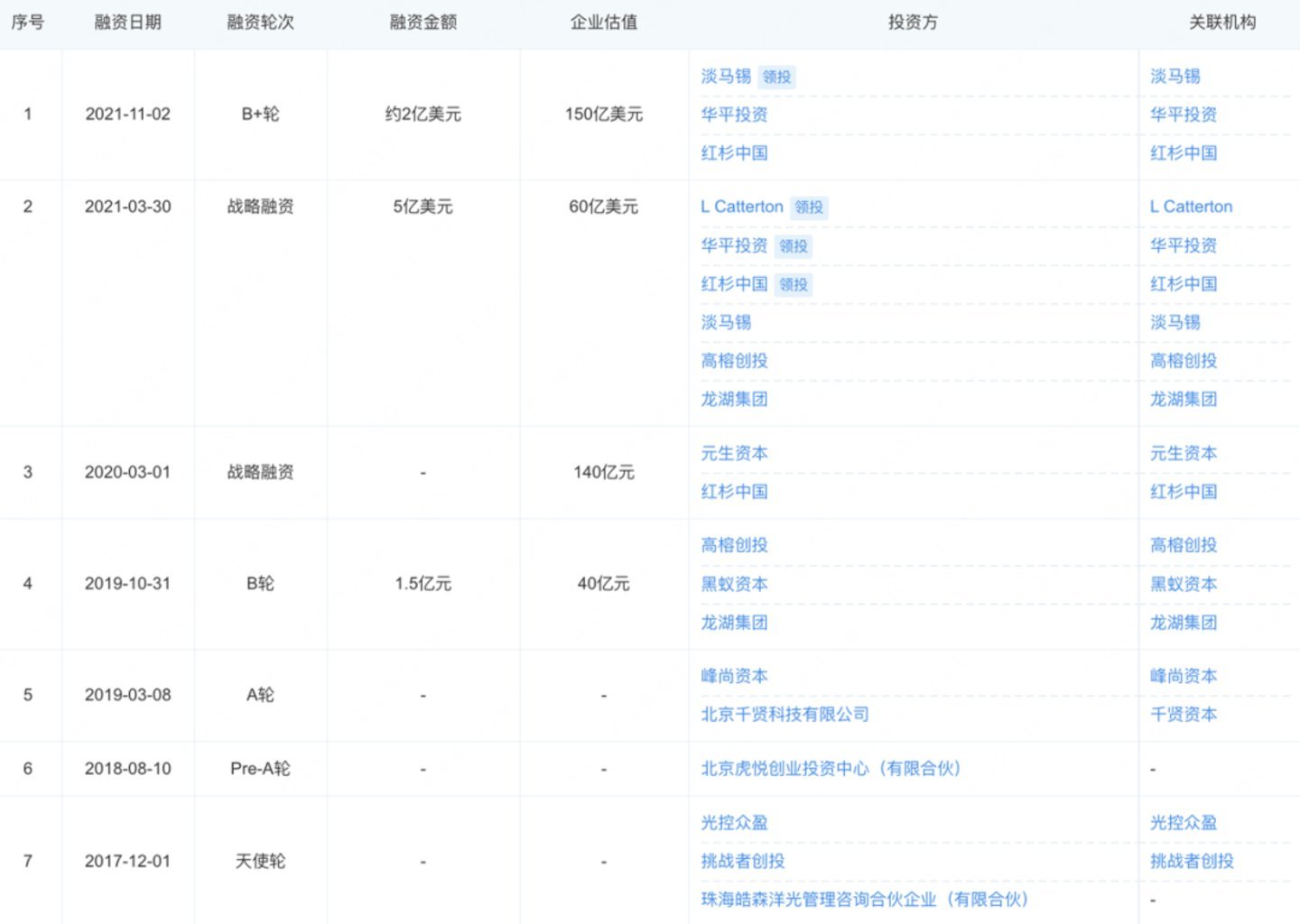 其投资者包括Temasek淡马锡、华平投资、红杉中国、L Catterton、高榕创投、龙湖集团、元生资本、黑蚁资本等知名投资机构。